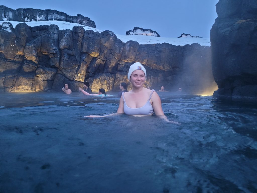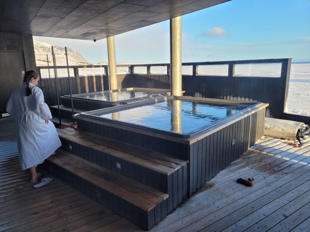 Amy getting in the hottub at Fosshotel