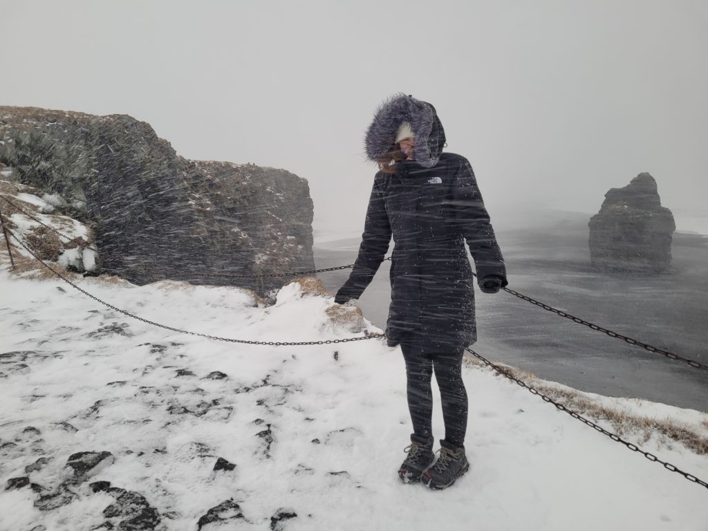 Amy at Dyrhólaey during a pop-up blizzard