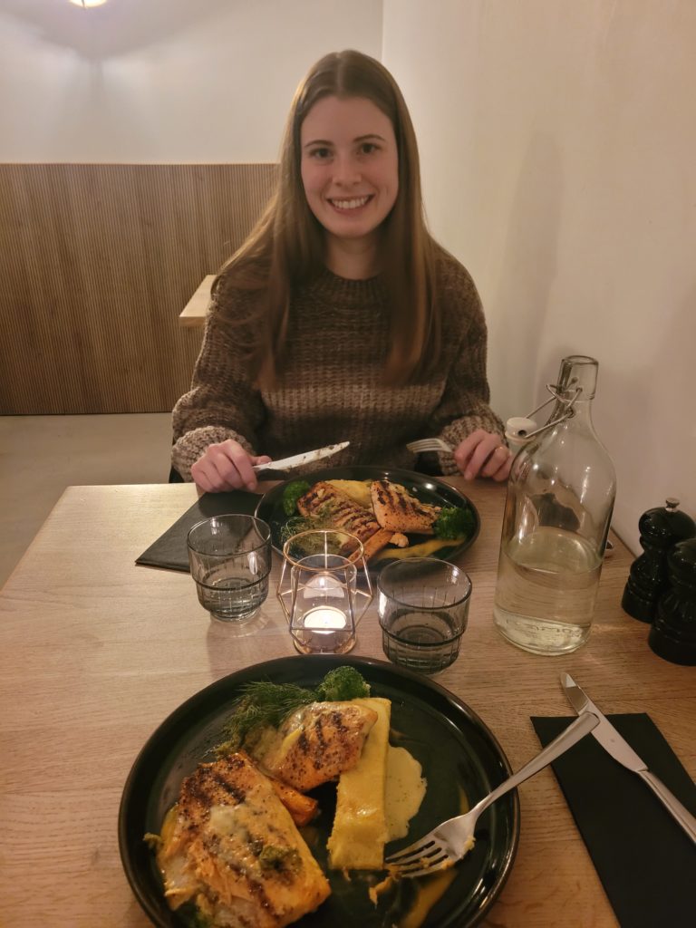 Lastly, we drove another hour or so to Magma Hotel in Kirkjubæjarklaustur. The hotel was divided into cozy, individual huts with turf roofs (covered in snow of course). It was the favorite stay of our trip. We dined at the onsite restaurant where we treated ourselves to some fresh Icelandic char with pesto and asparagus – absolutely delicious.