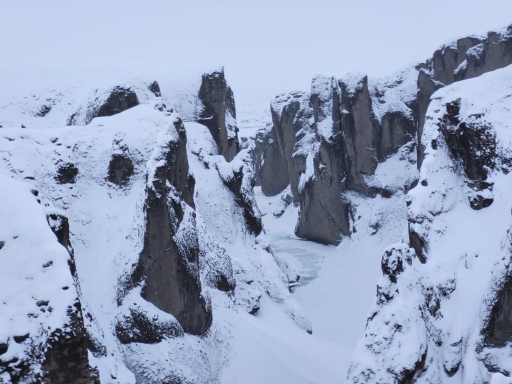 Our first stop was the impressive waterfall, Skógafoss, which included a long staircase to an overlook above the falls. We then continued along the road towards the town of Vik. The weather worsened and we were hit with our first true blizzard as we detoured to the rocky coastlines of Dyrhólaey. It was a wild experience to see massive, crashing waves pound the cliffs. However, it was hard for us to take it all in, as the wind was so strong and the snow so blinding that we found ourselves running around across the trails, shielding our faces from the ice. It was intense!