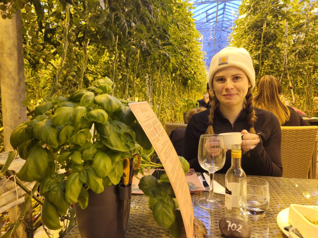 This was one of the most unique settings for a restaurant: the inside of a tomato greenhouse! Honey bees buzzed freely about and there was a pot of live basil on our table with a pair of scissors to cut our own herbs. All around us were rows and rows of cherry tomato plants. We learned that since tomatoes can’t grow outdoors in Iceland, greenhouses like these supply tomatoes for the entire country. Amy ordered their flagship tomato soup with fresh bread, while I tried a beer brewed with tomato and some ravioli. I can’t recommend this place highly enough.