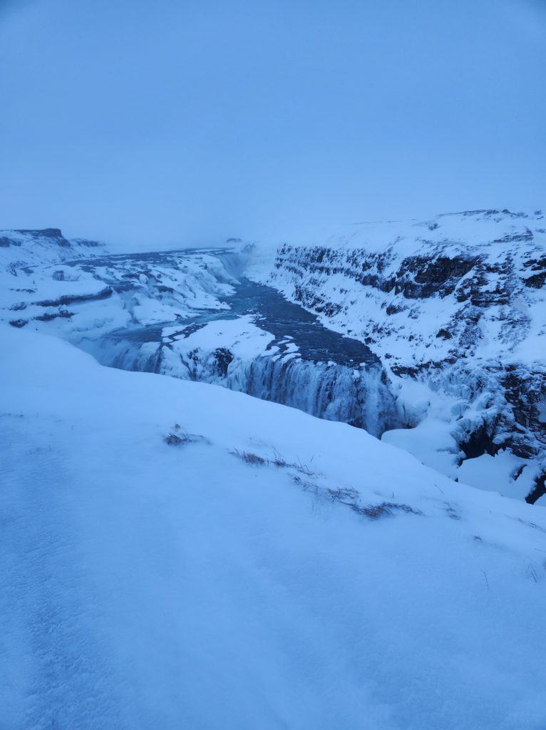 Last of the day was furthest destination on the Golden Circle, Gulfoss. We had to park a few hundred meters away and it was time for the Icelandic winter to remind us that Pittsburgh winters are for sissies. Yet another blinding snow storm with bitter cold wind accompanied us on our walk down to the phenomenal site. Gulfoss is a multi-tiered waterfall cascading between a ravine. We stayed to enjoy the view as long as we dared, then began the walk back to the car so we could hop over to Hotel Gulfoss. At the hotel, we enjoyed another delicious dinner at the restaurant onsite. Then we watched The Big Lebowski in our hotel room.