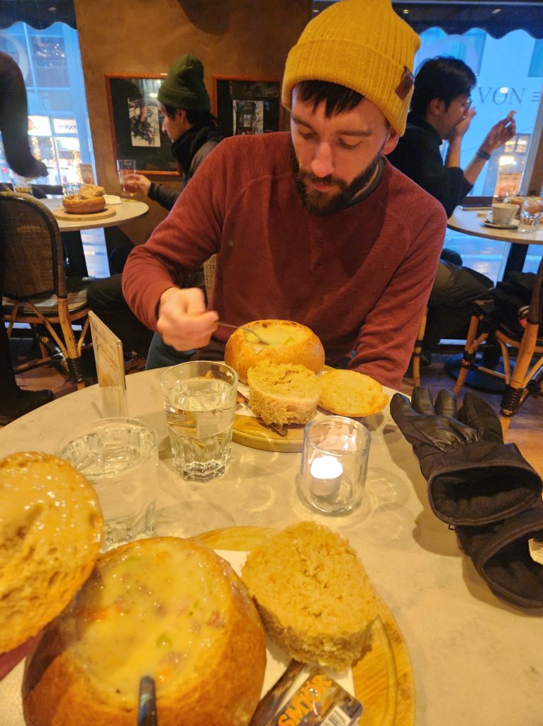 Alex eating soup at Svarta Kaffið