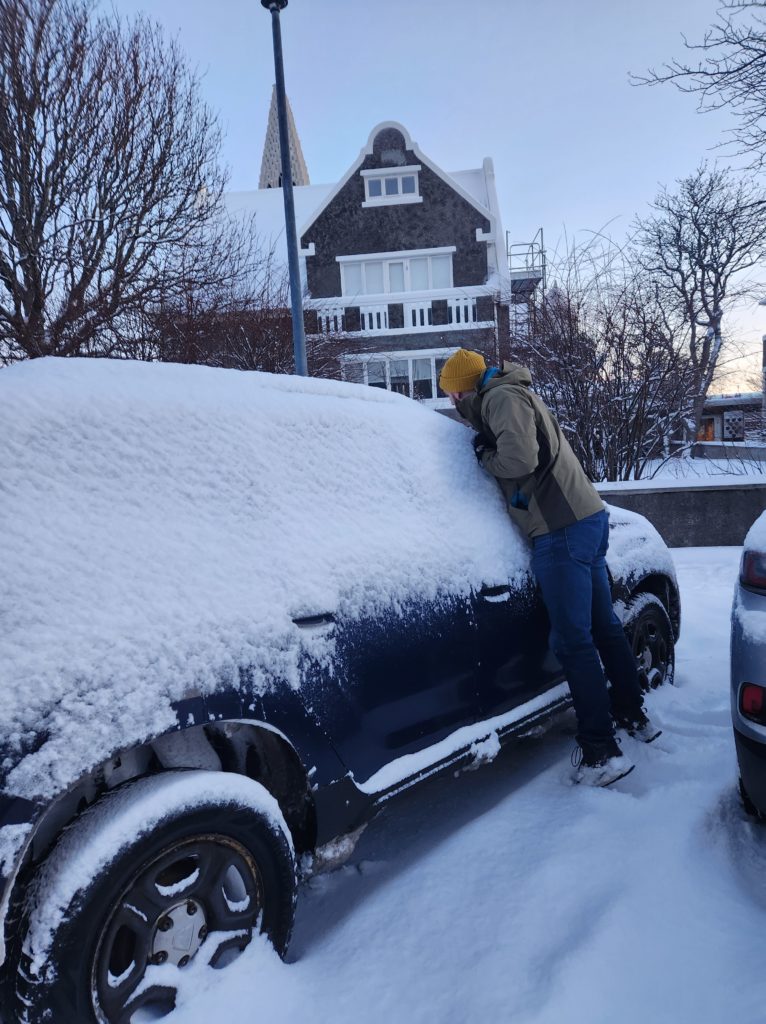 Average morning in Iceland: Alex brushing off the Dacia Duster
