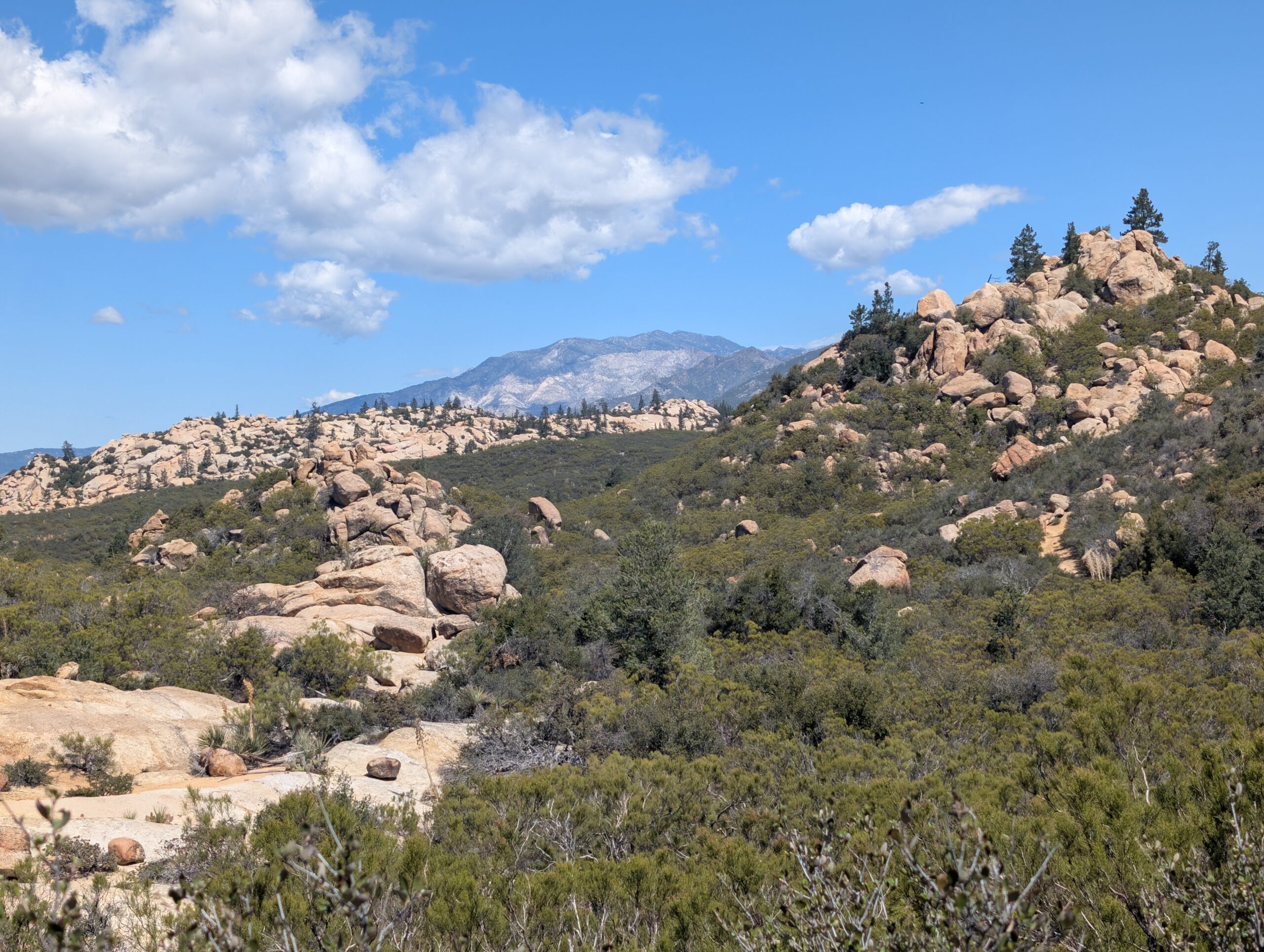 The landscape today featured more rolling hillsides with spotty brush and cacti. We hadn’t seen Mt. San Jacinto in a few days, due to the clouds, and we kept searching throughout the morning. Our blistering pace continued and we nearly covered 14 miles before a brief lunch break at noon.